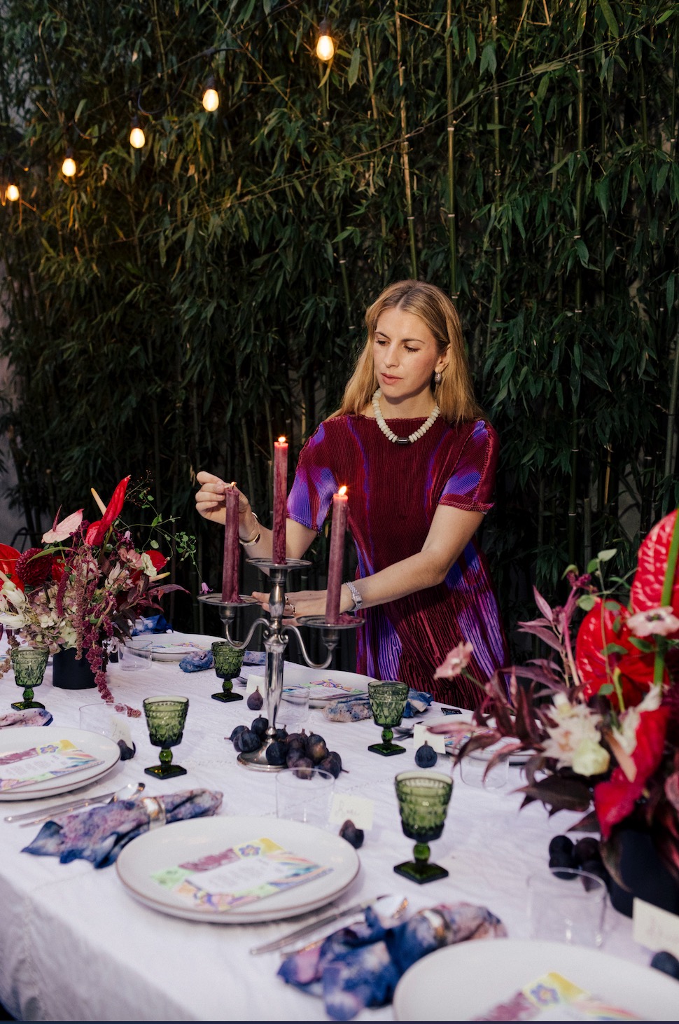 I’d bring in lots of taper candles (the really tall 18"+ ones are my favorite) to create height and atmosphere, and then layer in seasonal florals and produce. I often use produce as part of the design—candles set in tomatoes, fruit as place settings—small touches that feel whimsical. Then I use that produce afterward.