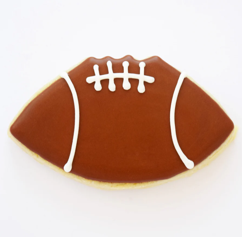 Back on the field theme: this classic football-shape cookie (available in their sports collection) is a versatile favourite. Smaller than the full field cookie, it works great in snack boxes, favour bags, or as a pre-game treat. A smart choice for mixing in with other themed décor and bites.