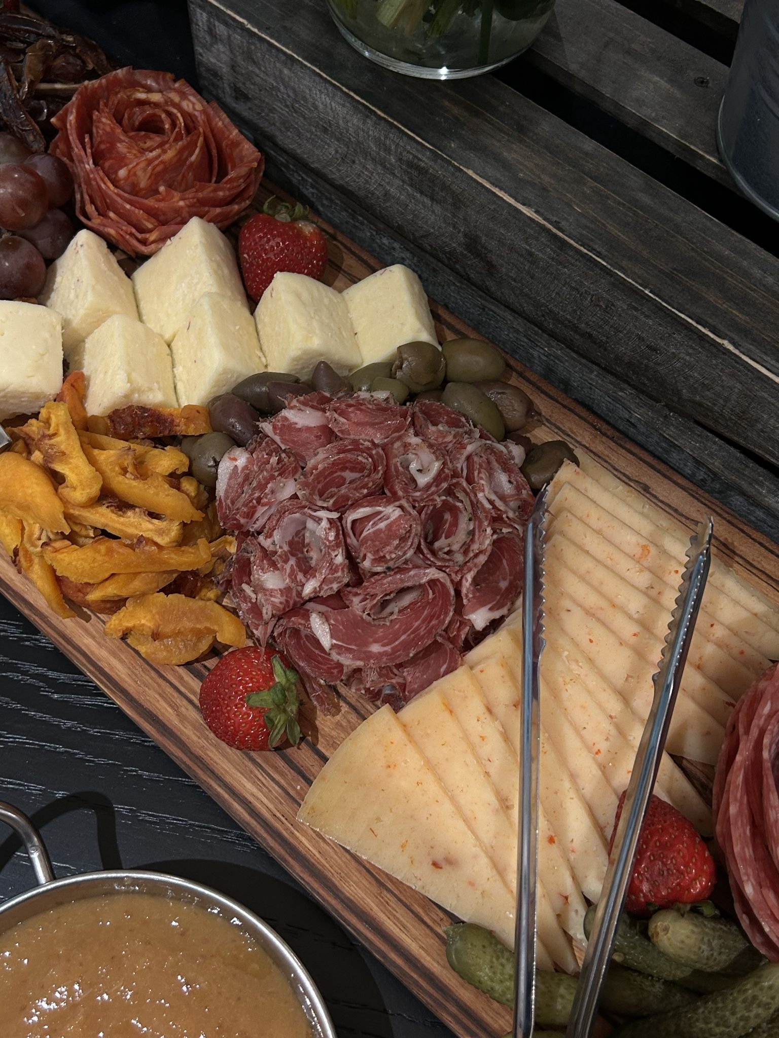 A: Meat and cheese can get expensive, so go straight to Trader Joe’s. Start with a baguette, grab manchego, blueberry goat cheese, olives, grapes, salami, and prosciutto. Then go to the flower section and grab hydrangea. Put them in a clear vase with lots of water. The stems look gorgeous, and they take up space while being pretty.