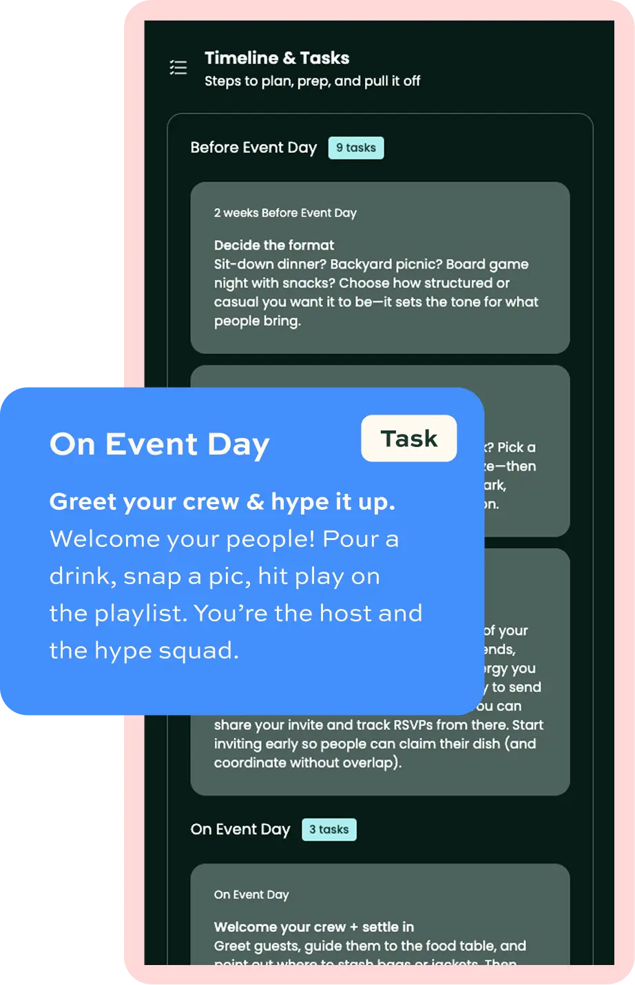 Go beyond the basics with a curated “Shop the Look” in our templates—real product links, actual menus, playlists, conversation starters, and entertainment ideas included. Review and customize your tasks, send invites, and track your RSVPs, all in one place.
